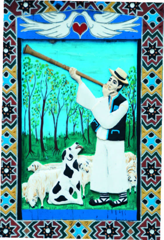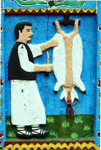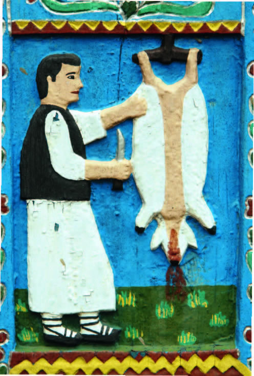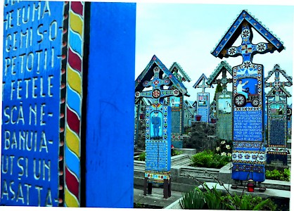 Es ist grau und trüb an diesem Nachmittag in Săpânța, einem 3500 Einwohner-Dorf am Fuße der Ostkarpaten. Und still. Ein Kleintransporter mit offener Ladefläche biegt langsam und fast lautlos von der Hauptstraße ab, ihm folgen gemessenen Schrittes Frauen und Männer, die, alt wie jung, in schwarze Kunstlederjacken gehüllt sind. Die Frauen tragen dazu dunkle Röcke und schwarze Kopftücher, die Männer ihre Sonntagshosen. Sie schweigen, nur hier und da wird getuschelt oder ein Kind zurechtgewiesen. Ein Bauer lenkt sein Pferdefuhrwerk an den Straßenrand, nimmt das Handy vom Ohr und verneigt sein Haupt, eine Roma-Familie rafft ihre Schuhware zusammen, die sie auf dem Bürgersteig ausgelegt hatte. Glockengeläut wird vernehmbar und durchbricht die Stille. Noch zwei Kurven, vorbei an den beiden Kneipen und den Holzbuden mit Keramik und Fellwesten, dann ist das Ziel erreicht. Und hinter dem hölzernen Eingangsportal tut sich eine andere Welt auf - eine fröhliche und farbenprächtige mit einem Grundton, der von Experten »Săpânța-Blau« genannt wird...