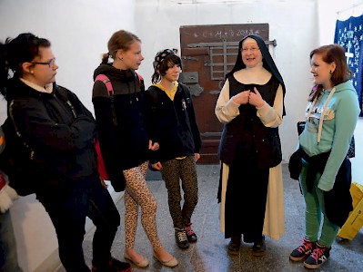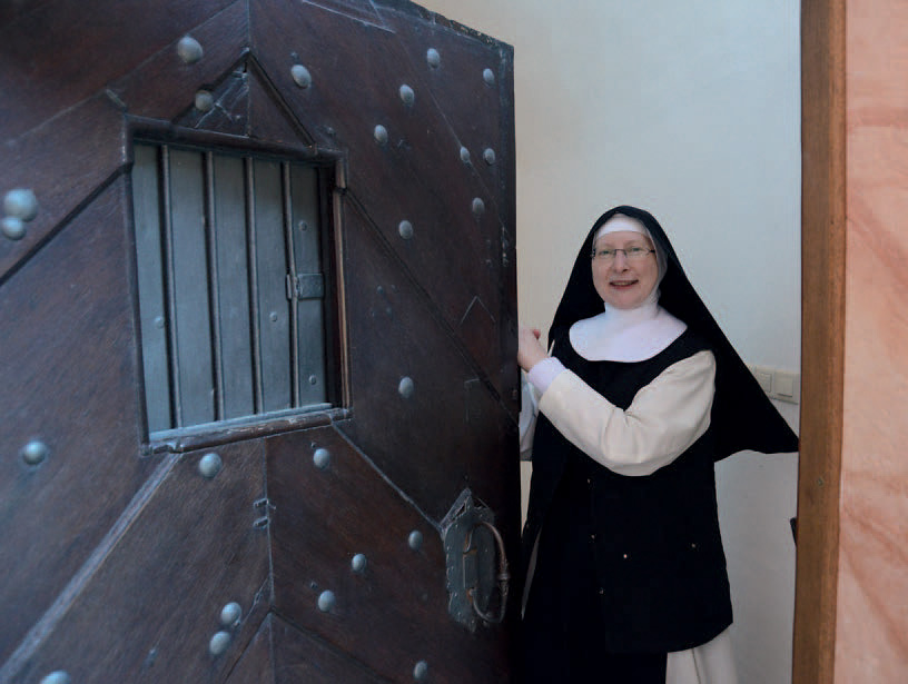 Versteckt liegt die Klosterpforte neben der Kirche mit der weiß-roten barocken Fassade. Viele sind diese Stufen hochgestiegen, haben unter dem steinernen Wappen gestanden und an die alte Holztür von Sankt Marienstern geklopft: Pilger, Reisende, Händler, Bedürftige. Das Fensterchen der Pforte ist verschlossen, und man erwartet, dass es aufgeht und ein Gesicht hinter den Gitterstäben erscheint. Stattdessen öffnet Pfortenschwester Benedicta, emeritierte Äbtissin, die Tür. Sie bittet ins Empfangszimmer, das mit seinem Kachelofen, dem Klavier und dem schweren Tisch wie ein gutbürgerliches Wohnzimmer aus vergangenen Tagen wirkt. Nur das laute Ticken der Wanduhr unterbricht die Stille. Wenig später eilt Schwester Gabriela in die Stube. Sie habe sich noch um eine betagte Mitschwester kümmern müssen, sagt sie mit Berliner Zungenschlag und hängt schwungvoll ihre Jacke über den Polsterstuhl. ..