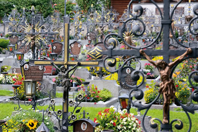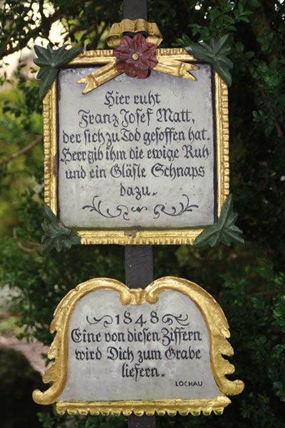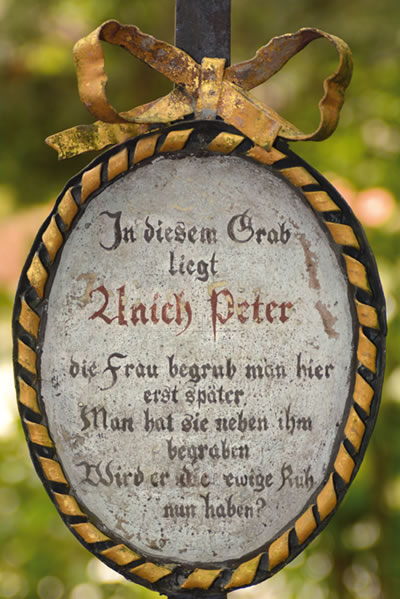 Seit über vierzig Jahren sammelt der Tiroler Kunstschmied Hans Guggenberger alte Grabkreuze mit skurrilen und makaberen Inschriften. Auf dem »Lustigen Friedhof« neben seinem Haus hat er siebzig von ihnen ausgestellt. Ein sepulkrales Kuriositätenkabinett?