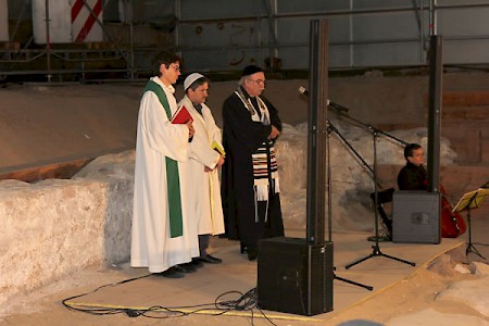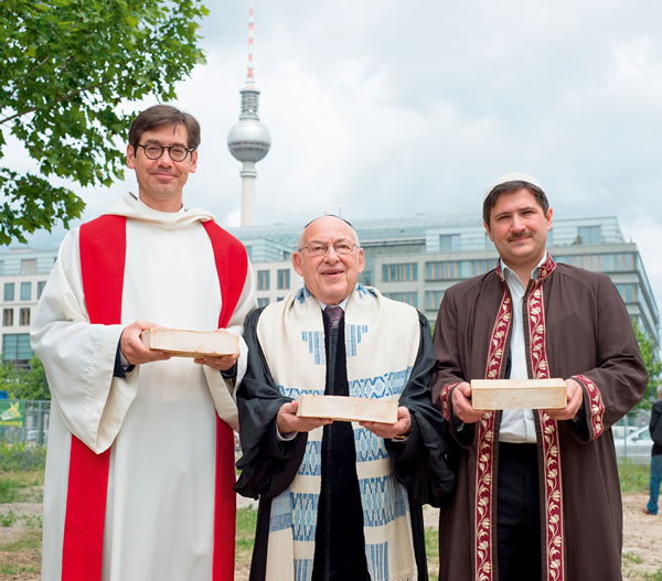 Draußen donnert der Vormittagsverkehr auf der sechsspurigen Gertraudenstraße vorbei. Das Bauzelt auf dem Petriplatz in Berlins Mitte verschluckt die Geräusche. Drinnen herrscht wenige Tage nach den Attentaten am 13. November in Paris andächtige Stille. Vertreter des House of One, eines interkulturellen Bet- und Lehrhauses, gedenken beim interreligiösen Friedensgebet der Opfer...