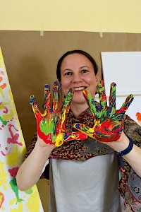 Auf der Staffelei stehen Kunststoffflaschen mit roter, blauer, gelber und grüner Acrylfarbe. Jutta Czapski schraubt einen Deckel ab und drückt einen dicken Klecks heraus. Mit einem schmatzenden Geräusch rutscht die dickflüssige Farbe auf den Teller. Er dient als Palette. Als Rot, Grün, Blau und Gelb den Teller bedecken, spreizt sie ihre Finger und legt sie in die Farben. Dann hebt sie ihre Hände und zeigt das Kunstwerk. Die in Klecksen angeordneten Farben gerieten durcheinander, aus der ursprünglich klaren Struktur entstand etwas Neues – schillernd, leuchtend, dunkel, lebensfroh und bedrohlich zugleich...