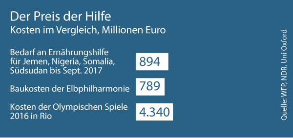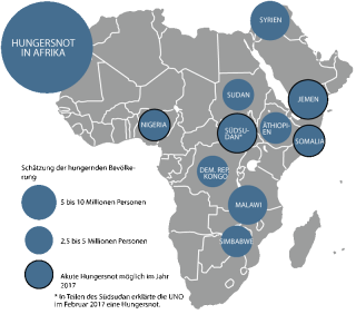 Der Wind ist heiß und weht heftig über die karge Ebene im Nordosten Somalias, die vereinzelten, niedrigen Büsche können ihn nicht brechen. Der Boden ist ausgetrocknet und rissig, hier und da liegen die Skelette von Ziegen, auch der aufgedunsene Kadaver eines Kamels. Es hat seit vielen Monaten nicht geregnet, die letzten beiden Regenzeiten blieben aus. Betroffen sind vor allem Somalia und seine Nachbarländer. Noch dramatischer ist die Lage im Bürgerkriegsland Südsudan. Dort haben die Vereinten Nationen in einigen Bezirken bereits den Hunger-Notstand ausgerufen. Mindestens 100 000 Menschen sind akut vom Hungertod bedroht, etwa 250 000 Kinder stark unterernährt. ..
