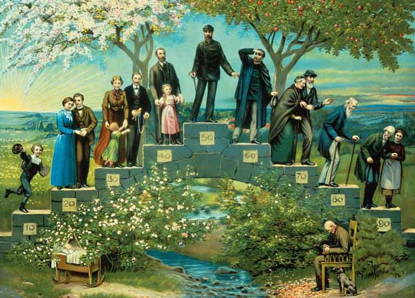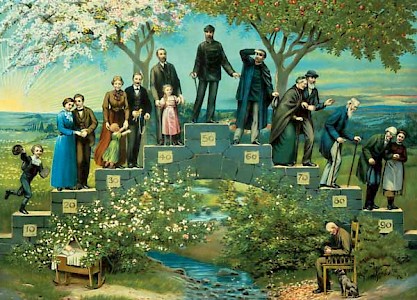 Das Motiv der Lebenstreppe war im Europa des 16. bis 19. Jahrhunderts die dominierende Darstellungsform des Alterns. In der Realität erreichten damals jedoch nur wenige Menschen das Ende der Treppe. Eine große Zahl gelangte nicht einmal über die erste Stufe hinaus. Viele starben mitten im Leben an Krankheiten oder Unfällen – an Altersschwäche dagegen nur wenige. In Deutschland um 1865 lag die durchschnittliche Lebenserwartung der Männer bei etwa 34, die der Frauen bei 37 Jahren, wobei diese Zahl durch die damals hohe Säuglings- und Kindersterblichkeit etwas verzerrt wird. Vermutlich kam der Altersphase 50+ in den Lebenstreppen der früheren Jahrhunderte auch deshalb eine so geringe Bedeutung zu...