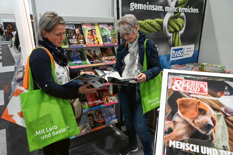 Zwölf Jugendliche sitzen um einen Sarg herum und sprechen über ihre Erfahrungen. Eben noch waren die Schüler für ein ziemlich ungewöhnliches Stationsspiel in der Bremer Messehalle unterwegs. In dessen Mittelpunkt stand eine traurige Geschichte über den nahen Tod eines ausgedachten Menschen. Die Aufgabe der Zehntklässler: Findet heraus, welche Hilfsmöglichkeiten es für ihn gibt. Hospize zum Beispiel, Palliativstationen, Seelsorge. Wer bezahlt das? Welche ehrenamtlichen Angebote gibt es? An wen muss man sich wenden? Lange suchen mussten sie nicht. Denn die Aktionen mit Schulklassen und Jugendgruppen gehörte zum Programm der diesjährigen Messe »Leben und Tod« in Bremen. Dort präsentieren rund 140 Aussteller mit Angeboten rund um das Thema Sterben. Die Ausstellung fand in diesem Jahr zum zehnten Mal statt. Über fünftausend Besucher kamen – so viele wie noch nie. An den Ständen von Kirchen, Hospizdiensten oder Sozialverbänden fanden die Jugendlichen schnell Ansprechpartner für ihre Fragen. Anschließend sprachen sie mit Betreuern über ihre Gefühle. Zum Schluss malten sie dazu noch ein Bild und legten es auf den Sarg in der Mitte des Raumes. Es ist ein ziemlich ernstes Spiel, das unter anderem katholische und evangelische Gemeinden für das Programm vorbereitet haben. Aber für die langjährige ehrenamtliche Hopizhelferin Britta Lucht ist es mehr als nur ein Spiel. »Es ist gut, dass junge Leute in guten Zeiten an das Thema herangeführt werden«, sagt die Vertreterin des Ehrenamts im Programmbeirat der Bremer Ausstellung. »Wenn sie mal wirklich selbst betroffen sind, dann stecken sie ja selbst zu sehr in ihrer Trauer.« Auch die Projektleiterin der Messe, Meike Wengler, betont: »Der Tod betrifft uns alle und macht vor dem Alter keinen Halt. Gerade junge Menschen fühlen sich in ihrer Trauer oft allein gelassen oder missverstanden.« Junge Menschen und ihre Trauer – das war eines der Themen bei der Ausstellung rund um das Thema Sterben. Zudem präsentierten Bestatter ihre Angebote ebenso wie Kirchen mit ihren Angeboten wie zum Beispiel Buchverlage, Friedhofsgärtner, Goldschmiede oder Versicherungen. In Vorträgen und Workshops, die ebenfalls zum Programm gehören, ging es in diesem Jahr zum Beispiel um den richtigen Umgang mit Patienten in der Palliativversorgung, um Trauerrituale oder die Sterbebegleitung von Menschen mit Behinderung. Ab Oktober 2020 wird das Erfolgskonzept zusätzlich in Freiburg veranstaltet. Das verkündeten Hans Peter Schneider, Geschäftsführer der Messe Bremen, und Thomas Arabin, Abteilungsleiter Messe bei der Messe Freiburg. »Das Konzept der LEBEN UND TOD passt zu Freiburg«, sagt Thomas Arabin. »Die Menschen hier haben eine sehr lebensbewusste Einstellung und ein großes Interesse an der Thematik. Zudem sind sich die beiden Standorte in ihrer Struktur und Größe sehr ähnlich. In diesem Kontext macht die Durchführung der Veranstaltung in Freiburg absolut Sinn.«..