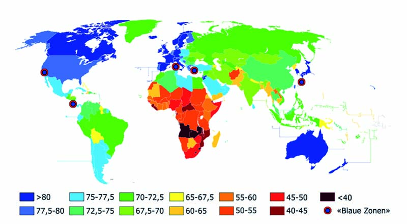 Neben Okinawa gibt es weitere Regionen in der Welt, in denen Menschen viel länger leben als der Durchschnitt. Sie werden »Blaue Zonen« genannt. Dieser Begriff wurde zuerst von dem amerikanischen Bestsellerautor Dan Buettner verwendet. Er machte 2005 eine Studienreise rund um die Welt und publizierte seine Ergebnisse in der Zeitschrift »National Geographic« unter dem Titel »The Secrets of Long Life«. Gebiete, in denen Menschen außergewöhnlich lange leben, markierte er auf einer Karte mit blauen Kreisen. - Icaria, Griechenland: Auf der Insel ernähren sich die Menschen vorwiegend mit einer »Mittelmeerdiät«, viel Olivenöl, Rotwein und einheimisches Gemüse. - Ogliastra, Sardinien, Italien: Hier leben einige der ältesten Männer der Welt. Sie leben in Bergregionen, in denen sie normalerweise auf Bauernhöfen arbeiten und viel Rotwein trinken. - Halbinsel Nicoya, Costa Rica: Die nicoyanische Ernährung basiert auf Bohnen und Maistortillas. Die Menschen in dieser Region verrichten regelmäßig körperliche Arbeiten bis ins hohe Alter und haben einen Lebensgefühlszweck, der als »Plan de Vida« bekannt ist. - Die Siebenten-Tags-Adventisten in Loma Linda, Kalifornien, USA: Diese sehr religiöse Gruppe von Menschen sind strenge Vegetarier und leben in engen Gemeinschaften. - Okinawa Japan: Hier leben die ältesten Frauen der Welt, die viel Lebensmittel auf Sojabasis essen...