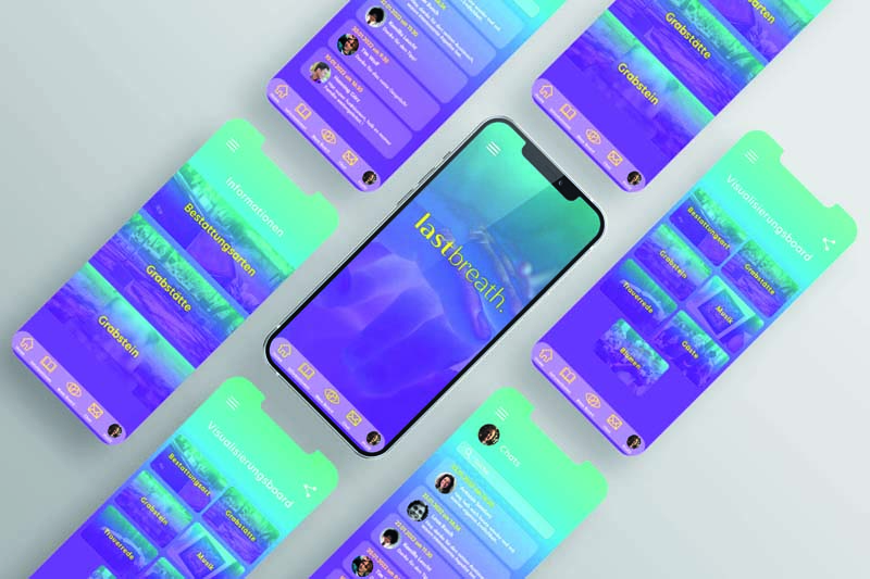 »Last Breath – die App für Deine Endlichkeit« ist eine Entwicklung der jungen Kommunikationsdesignerin Sabine Schneider. Sie befasste sich zunächst im Rahmen eines Studienprojekts mit dem Tod als Thema für eine Ausstellung und recherchierte dafür ausführlich zum gesellschaftlichen Umgang mit dem Tod. Das Thema faszinierte sie so sehr, dass sie es schließlich in den Mittelpunkt ihrer Bachelor-Arbeit stellte. Ihre Leitfrage: »Wie lässt sich der Tod mithilfe von Gestaltung in der heutigen Gesellschaft enttabuisieren?«..