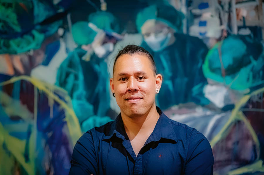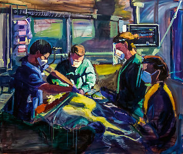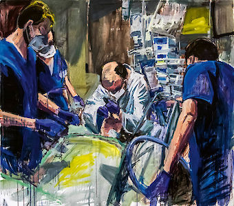 Seine Bilder zeigen Szenen aus dem Krankenhaus. Während seiner Schicht fotografiert er mit dem Handy, die Fotos dienen seinen Gemälden als Vorlage. In Öl verewigt er seine Kolleginnen und Kollegen auf großformatigen Leinwänden, fast immer mindestens 1,60 Meter auf 1,80 Meter. »Dann ist man drinnen in dem Bild, man ist ein Teil davon, das ist mir wichtig«, sagt er...